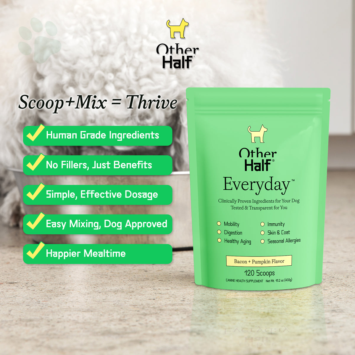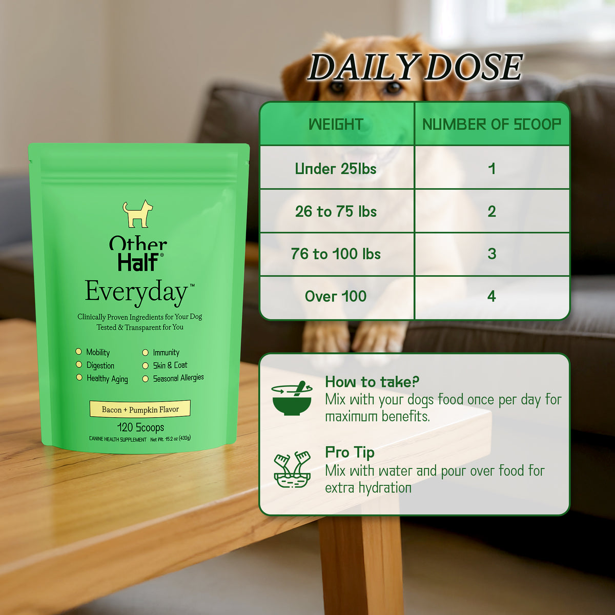 Mix with your dog's food once per day for maximum benefits.